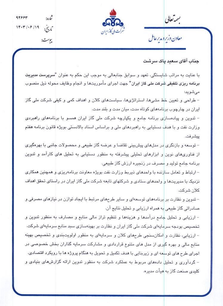 سعید پاکسرشت، سرپرست مدیریت برنامهریزی تلفیقی شرکت ملی گاز ایران منصوب شد