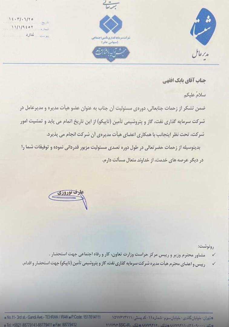 طی حکمی از سوی مدیرعامل شستا؛ افقهی از مدیرعاملی تاپیکو تعدیل شد