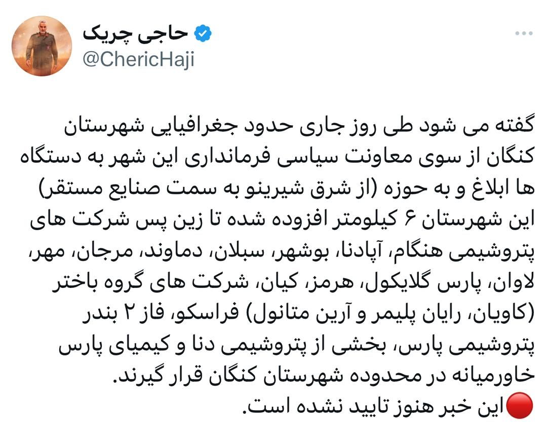 گفته میشود طی روز جاری حدود جغرافیایی شهرستان کنگان از سوی معاونت سیاسی فرمانداری این شهر به دستگاهها ابلاغ و به حوزه (از شرق شیرینو به سمت صنایع مستقر)