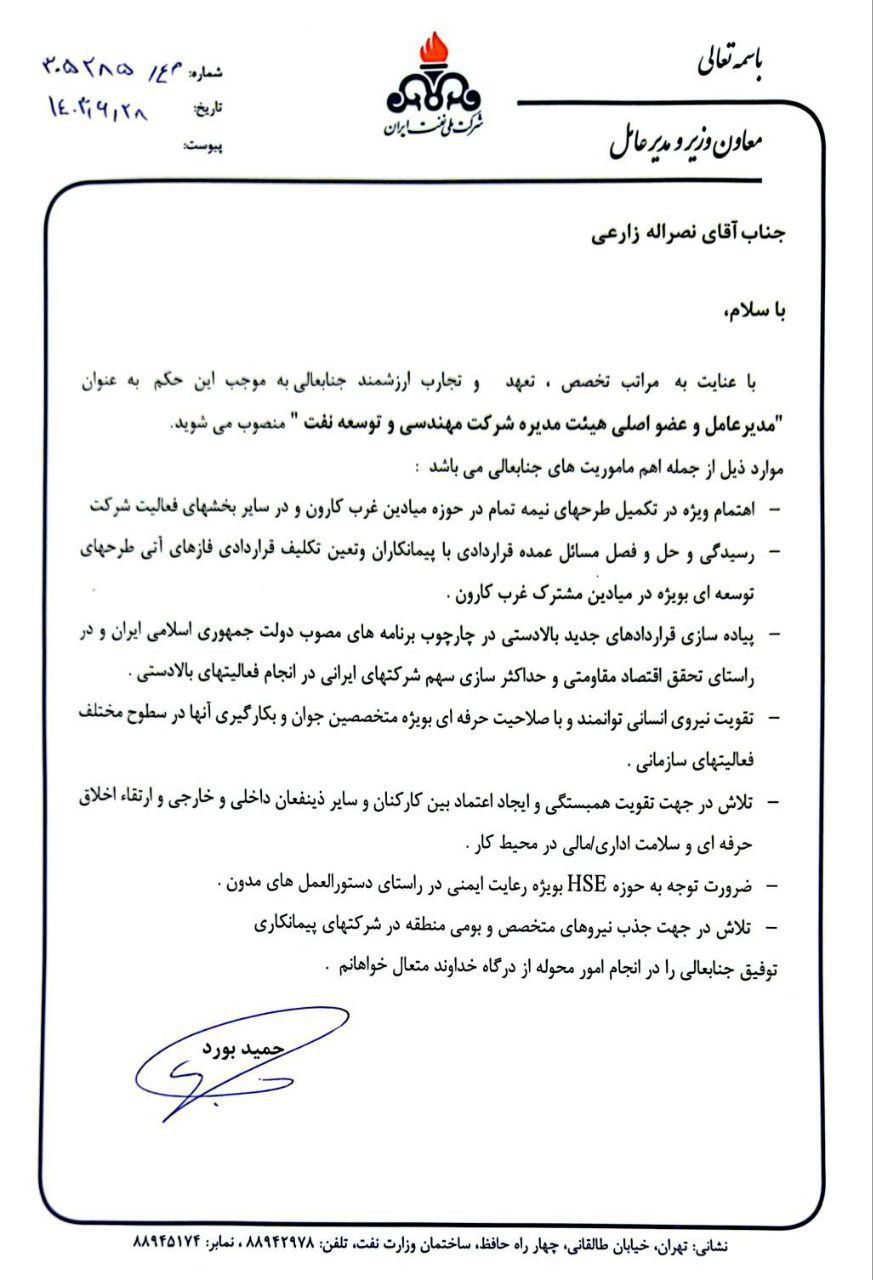 به گزارش فراز انرژی، حمید بورد، مدیرعامل شرکت ملی نفت ایران طی حکمی «نصراله زارعی» را به عنوان مدیرعامل شرکت مهندسی و توسعه نفت (متن) منصوب کرد.