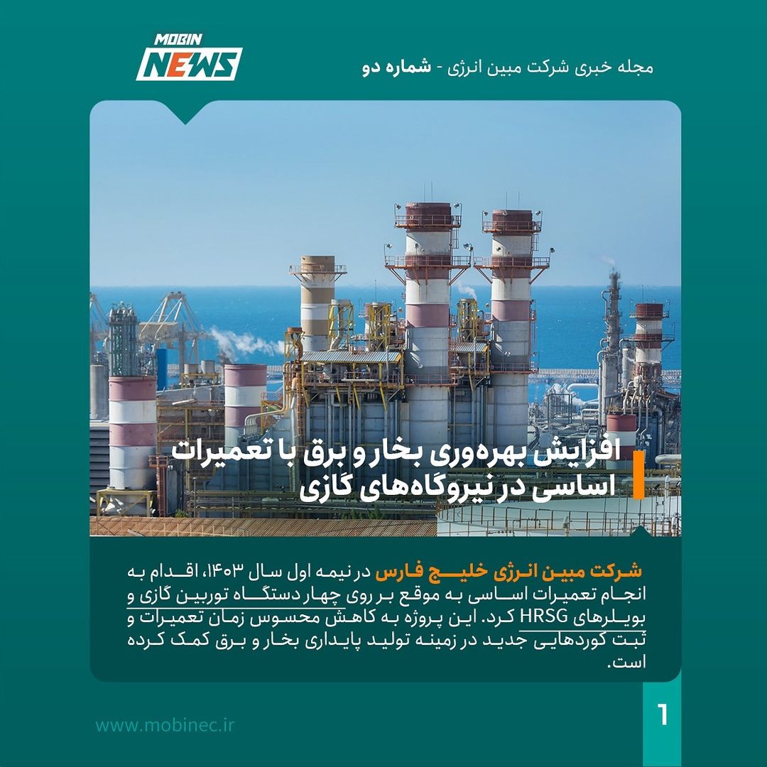 به گزارش فراز انرژی به نقل از روابط عمومی شرکت مبین انرژی خلیج فارس، این شرکت مجله خبری شماره دوم خود را شرح زیر منتشر کرد. افزایش بهره وری بخار و برق با تعمیرات اساسی در نیروگاههای گازی شرکت مبین انرژی خلیج فارس در نیمه اول سال ۱۴۰۳، اقدام به انجام تعمیرات اساسی به موقع