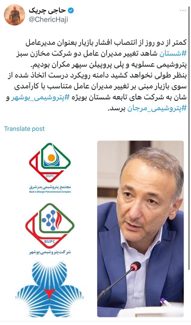 کمتر از دو روز از انتصاب افشار بازیار بعنوان مدیرعامل شستان شاهد تغییر مدیران عامل دو شرکت مخازن سبز پتروشیمی عسلویه و پلی پروپیلن سپهر مکران بودیم.