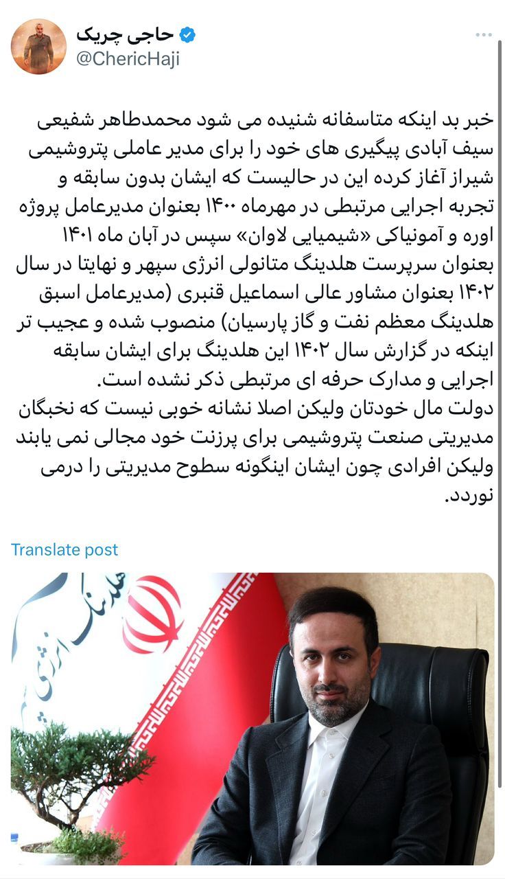 خبر بد اینکه متاسفانه شنیده میشود محمدطاهر شفیعی سیف آبادی پیگیریهای خود را برای مدیر عاملی پتروشیمی شیراز آغاز کرده این در حالیست که ایشان بدون سابقه و تجربه اجرایی مرتبطی در مهرماه ۱۴۰۰ بعنوان مدیرعامل پروژه اوره و آمونیاکی «شیمیایی لاوان»
