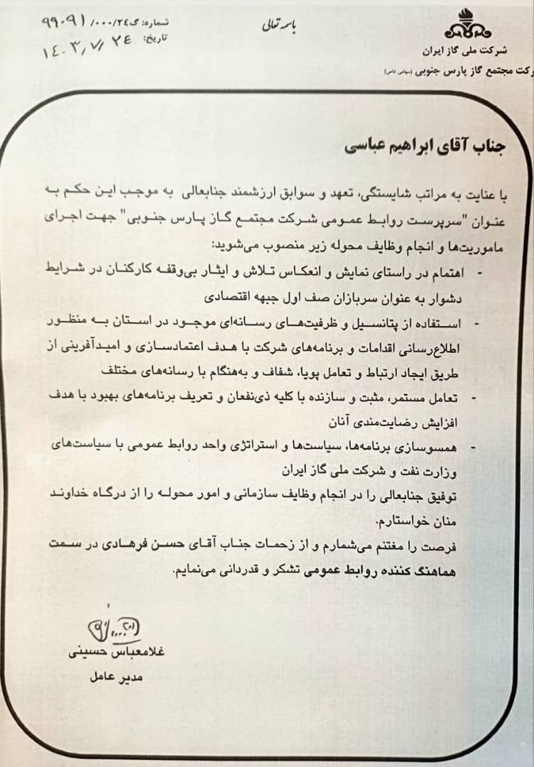 ابراهیم عباسی به عنوان «سرپرست روابط عمومی» مجتمع گاز پارس جنوبی منصوب شد
