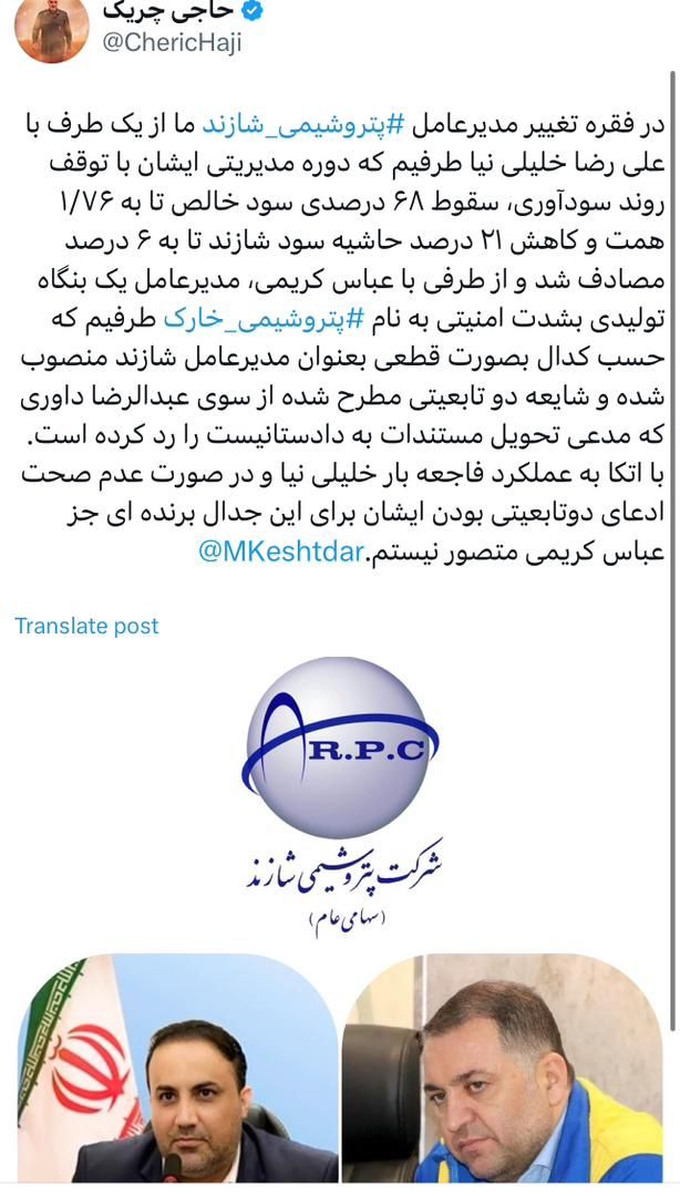 در فقره تغییر مدیرعامل پتروشیمی شازند ما از یک طرف با علی رضا خلیلی نیا طرفیم که دوره مدیریتی ایشان با توقف روند سودآوری، سقوط ۶۸ درصدی سود خالص تا به ۱/۷۶ همت و کاهش ۲۱ درصد حاشیه سود شازند تا به ۶ درصد مصادف شد و از طرفی با عباس کریمی،