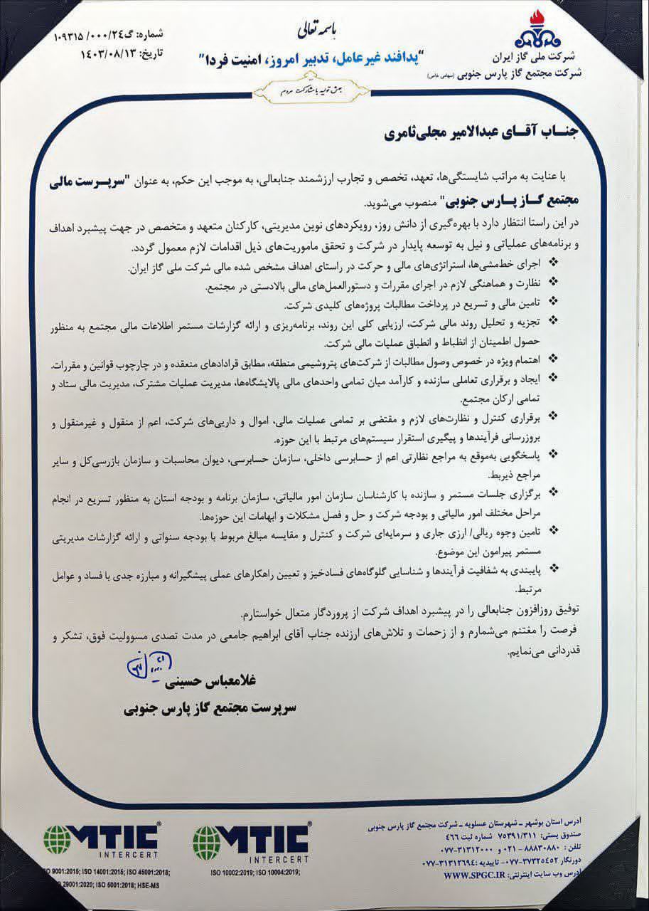 با صدور حکمی توسط غلامعباس حسینی، مدیرعامل مجتمع گاز پارس جنوبی، عبدالامیر مجلی ثامری به عنوان سرپرست مالی این شرکت منصوب شد.