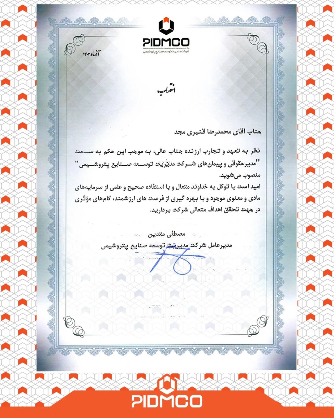 در متن حکم آمده است: «نظر به تعهد و تجارب ارزنده جنابعالی، به موجب این حکم به عنوان مدیر حقوقی و پیمانهای شرکت مدیریت توسعه صنایع پتروشیمی منصوب میشوید.