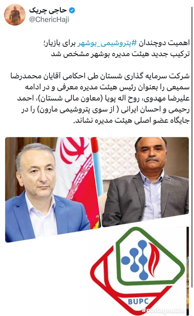 شرکت سرمایهگذاری شستان طی احکامی آقایان محمدرضا سمیعی را بعنوان رئیس هیئت مدیره معرفی و در ادامه علیرضا مهدوی، روح اله پویا (معاون مالی شستان)، احمد رحیمی و احسان ایرانی (از سوی پتروشیمی مارون) را در جایگاه عضو اصلی هیئت مدیره نشاند. برای مشاهدهی توییتهای حاجی چریک اینجا کلیک کنید.