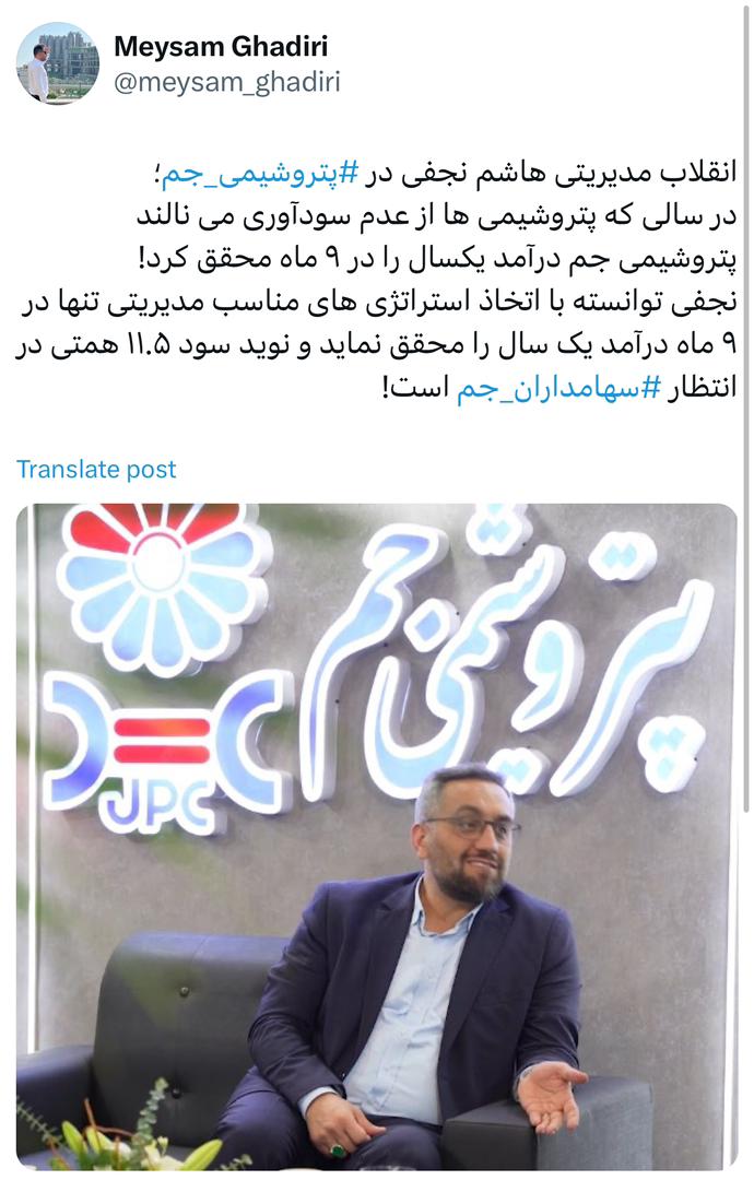 در سالی که پتروشیمیها ازعدم سودآوری مینالند پتروشیمی جم درآمد یکسال را در ۹ ماه محقق کرد! نجفی توانسته با اتخاذ استراتژیهای مناسب مدیریتی تنها در ۹ ماه درآمد یک سال را محقق نماید و نوید سود ۱۱.۵ همتی در انتظار سهامداران جم است! برای مشاهده دیگر توییت های میثم قدیری اینجا کلیک کنید.