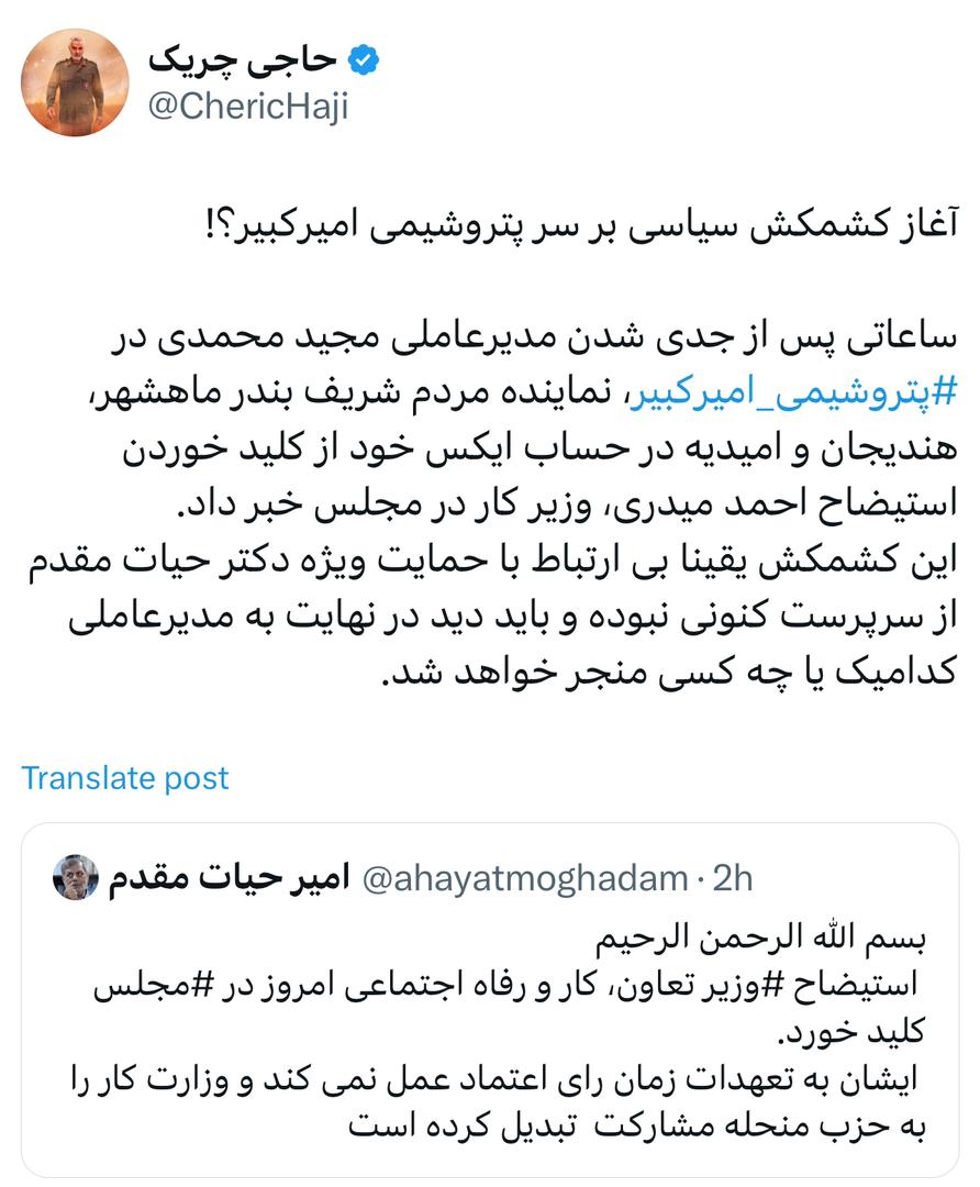ساعاتی پس از جدی شدن مدیرعاملی مجید محمدی در پتروشیمی امیرکبیر، نماینده مردم شریف بندر ماهشهر، هندیجان و امیدیه در حساب ایکس خود از کلید خوردن استیضاح احمد میدری، وزیر کار در مجلس خبر داد.