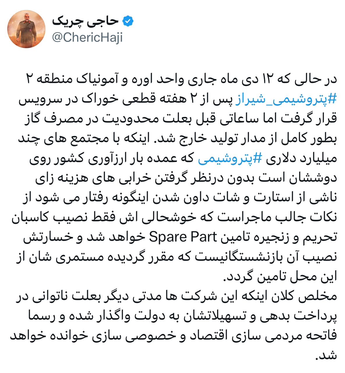 در حالی که ۱۲ دی ماه جاری واحد اوره و آمونیاک منطقه ۲ ⁧‫پتروشیمی شیراز‬⁩ پس از ۲ هفته قطعی خوراک در سرویس قرار گرفت اما ساعاتی قبل بعلت محدودیت در مصرف گاز بطور کامل از مدار تولید خارج شد. اینکه با مجتمع‌های چند میلیارد دلاری پتروشیمی‬⁩ که عمده بار ارزآوری کشور روی دوششان است بدون درنظر گرفتن خرابی‌های هزینه زای ناشی از استارت و شات داون شدن اینگونه رفتار می‌شود از نکات جالب ماجراست که خوشحالی‌اش فقط نصیب کاسبان تحریم و زنجیره تامین Spare Part خواهد شد و خسارتش نصیب آن بازنشستگانیست که مقرر گردیده مستمری‌شان از این محل تامین گردد.