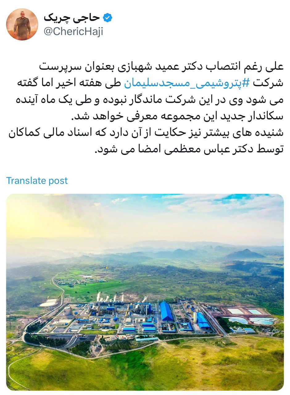 علی رغم انتصاب دکتر عمید شهبازی بعنوان سرپرست شرکت پتروشیمی مسجدسلیمان‬⁩ طی هفته اخیر اما گفته می‌شود وی در این شرکت ماندگار نبوده و طی یک ماه آینده سکاندار جدید این مجموعه معرفی خواهد شد.