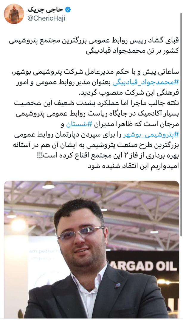 قبای گشاد رییس روابط عمومی بزرگترین مجتمع پتروشیمی کشور بر تن محمدجواد قبادبیگی