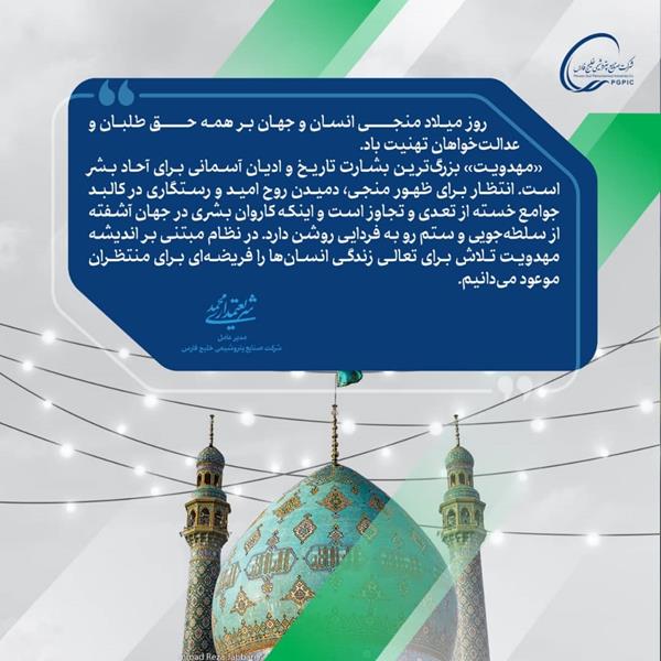 مدیرعامل شرکت صنایع پتروشیمی خلیج فارس در پیامی میلاد منجی انسان و جهان را تبریک گفت.