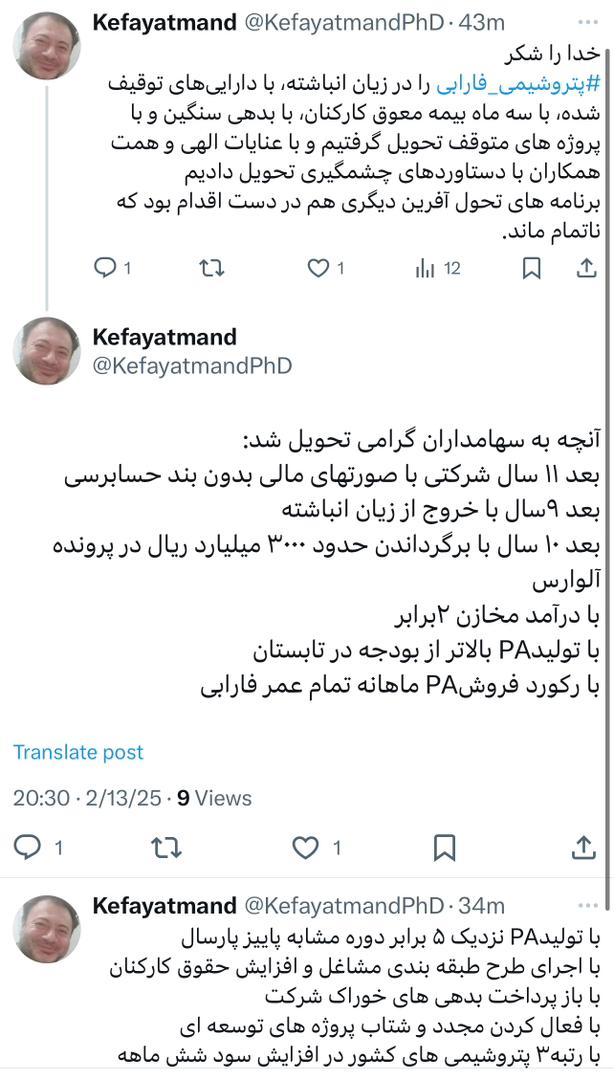 مدیرعامل سابق شرکت پتروشیمی فارابی در ایکس نوشت؛