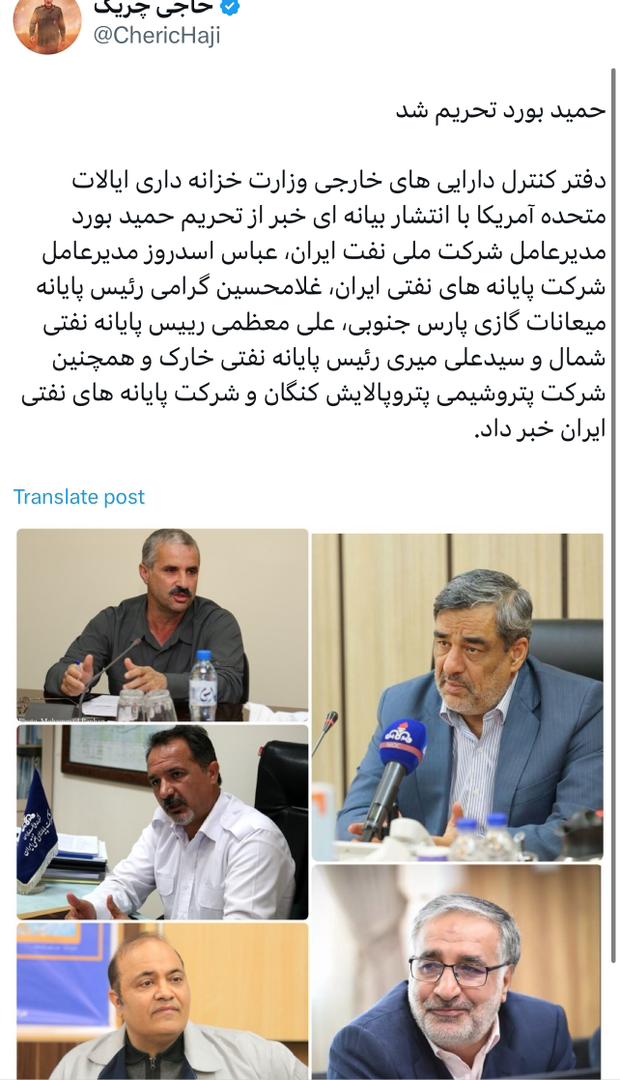 دفتر کنترل داراییهای خارجی وزارت خزانه داری ایالات متحده آمریکا با انتشار بیانهای خبر از تحریم حمید بورد مدیرعامل شرکت ملی نفت ایران، عباس اسدروز مدیرعامل شرکت پایانههای نفتی ایران، غلامحسین گرامی رئیس پایانه میعانات گازی پارس جنوبی، علی معظمی رییس پایانه نفتی شمال و سیدعلی میری رئیس پایانه نفتی خارک و همچنین شرکت پتروشیمی پتروپالایش کنگان و شرکت پایانههای نفتی ایران خبر داد.