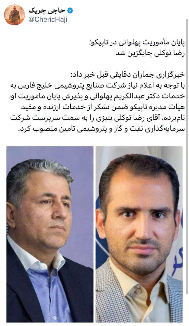 با توجه به اعلام نیاز شرکت صنایع پتروشیمی خلیج فارس به خدمات دکتر عبدالکریم پهلوانی و پذیرش پایان ماموریت او، هیات مدیره تاپیکو ضمن تشکر از خدمات ارزنده و مفید نامبرده، آقای رضا توکلی بنیزی را به سمت سرپرست شرکت سرمایهگذاری نفت و گاز و پتروشیمی تامین منصوب کرد.