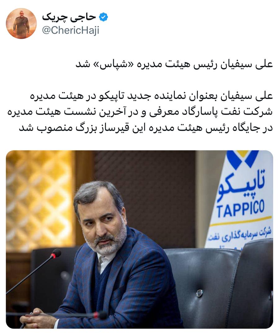علی سیفیان بعنوان نماینده جدید تاپیکو در هیئت مدیره شرکت نفت پاسارگاد معرفی و در آخرین نشست هیئت مدیره در جایگاه رئیس هیئت مدیره این قیرساز بزرگ منصوب شد