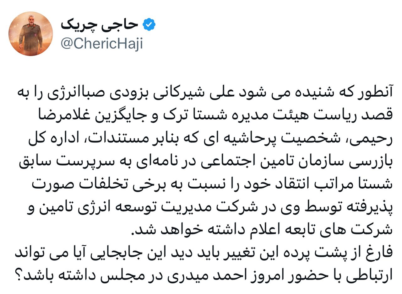 برچسب ها :احمد میدری ، حاجی چریک ، شستا ، علی شیرکانی ، هلدینگ صباانرژی ، هیئت مدیره