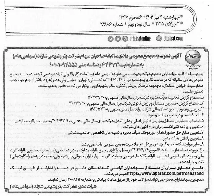 شرکت پتروشیمی شازند سهامداران خود را برای شرکت در مجمع عمومی عادی سالیانه برای سال مالی منتهی به ۱۴۰۳/۱۲/۳۰ فراخواند