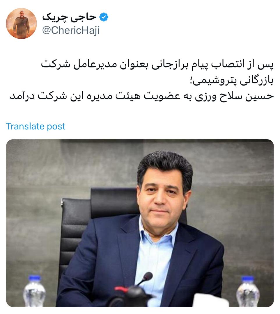 پس از انتصاب پیام برازجانی بعنوان مدیرعامل شرکت بازرگانی پتروشیمی؛ حسین سلاح ورزی به عضویت هیئت مدیره این شرکت درآمد