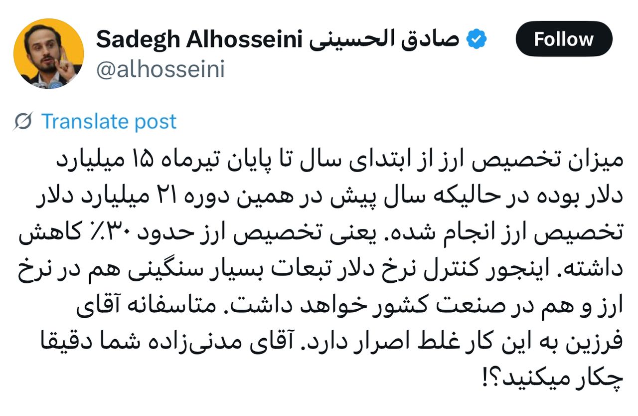 میزان تخصیص ارز از ابتدای سال تا پایان تیرماه ۱۵ میلیارد دلار بوده در حالیکه سال پیش در همین دوره ۲۱ میلیارد دلار تخصیص ارز انجام شده. یعنی تخصیص ارز حدود ۳۰٪ کاهش داشته. اینجور کنترل نرخ دلار تبعات بسیار سنگینی هم در نرخ ارز و هم در صنعت کشور خواهد داشت. متاسفانه آقای فرزین به این کار غلط اصرار دارد. آقای مدنیزاده شما دقیقا چکار میکنید؟!