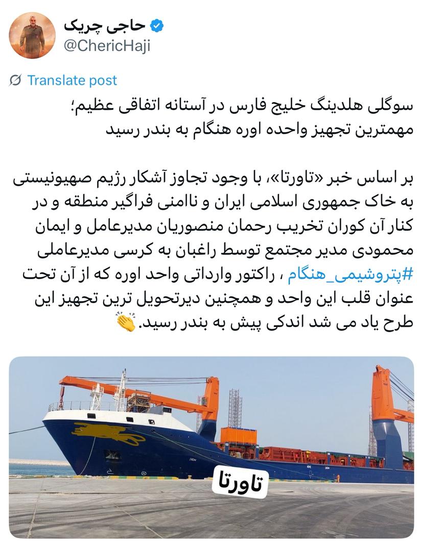 بر اساس خبر «تاورتا»، با وجود تجاوز آشکار رژیم صهیونیستی به خاک جمهوری اسلامی ایران و ناامنی فراگیر منطقه و در کنار آن کوران تخریب رحمان منصوریان مدیرعامل و ایمان محمودی مدیر مجتمع توسط راغبان به کرسی مدیرعاملی پتروشیمی هنگام‬⁩، راکتور وارداتی واحد اوره که از آن تحت عنوان قلب این واحد و همچنین دیرتحویل‌ترین تجهیز این طرح یاد می‌شد اندکی پیش به بندر رسید.