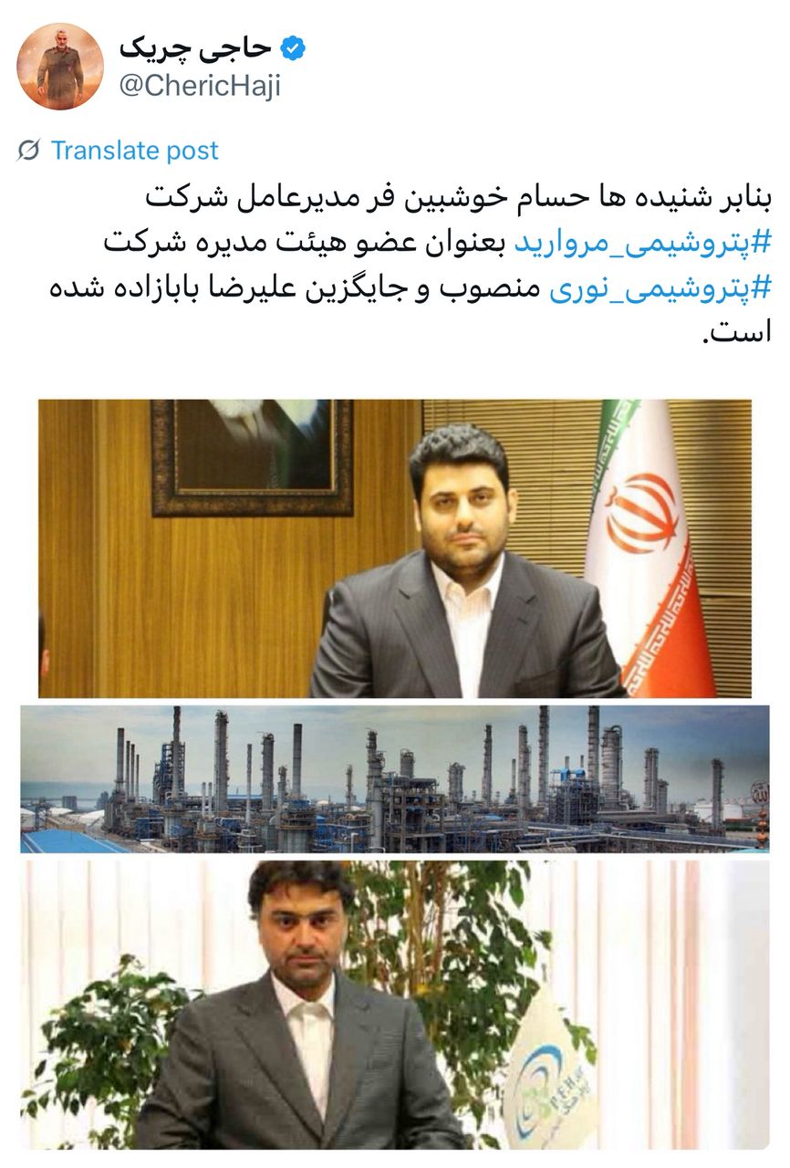 به گزارش فراز انرژی، حسام خوشبین فر مدیرعامل شرکت پتروشیمی مروارید بعنوان عضو هیئت مدیره شرکت پتروشیمی نوری منصوب و جایگزین علیرضا بابازاده شده است. برای مشاهدهی توییتهای حاجی چریک اینجا کلیک کنید.