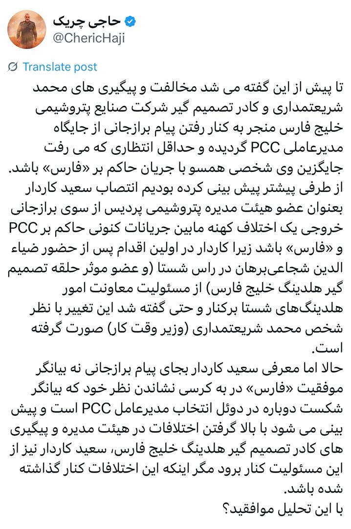 تا پیش از این گفته میشد مخالفت و پیگیریهای محمد شریعتمداری و کادر تصمیم گیر شرکت صنایع پتروشیمی خلیج فارس منجر به کنار رفتن پیام برازجانی از جایگاه مدیرعاملی PCC گردیده و حداقل انتظاری که میرفت جایگزین وی شخصی همسو با جریان حاکم بر «فارس» باشد.