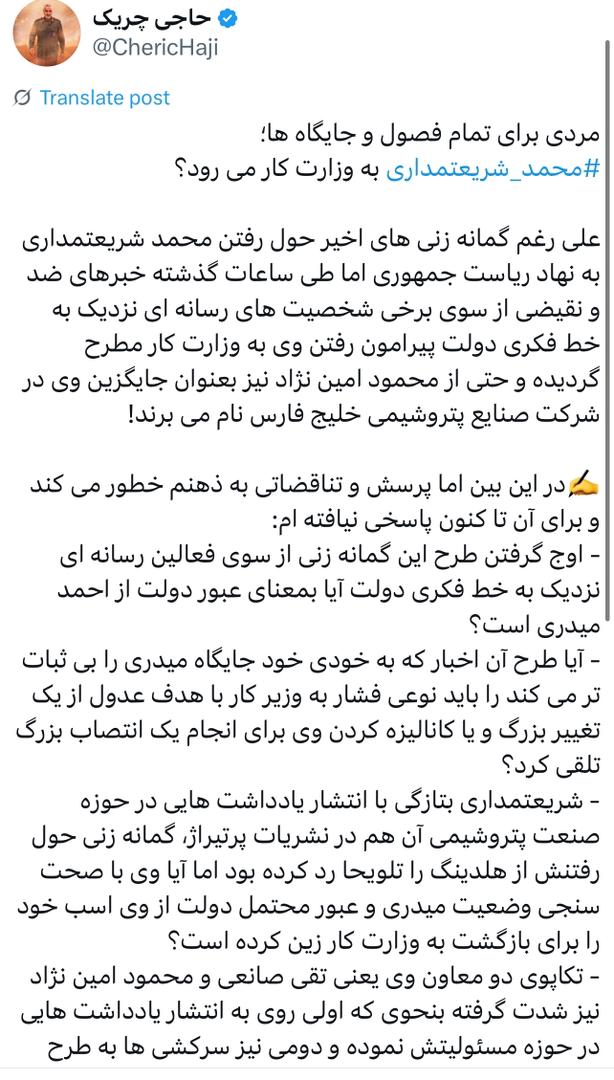 – شریعتمداری بتازگی با انتشار یادداشتهایی در حوزه صنعت پتروشیمی آن هم در نشریات پرتیراژ، گمانه زنی حول رفتنش از هلدینگ را تلویحا رد کرده بود اما آیا وی با صحتسنجی وضعیت میدری و عبور محتمل دولت از وی اسب خود را برای بازگشت به وزارت کار زین کرده است؟