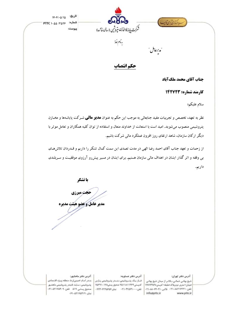 حکم انتصاب جناب آقای محمد ملک آباد به عنوان مدیر مالی شرکت پایانهها و مخازن پتروشیمی