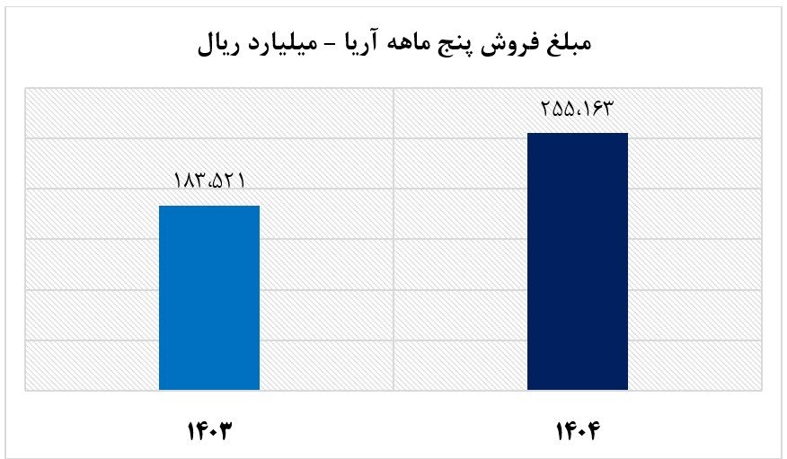 آریا در پنج ماهه ابتدایی سال ۱۴۰۴ فروشی معادل ۲۵۵ هزار میلیارد ریال داشته که این مقدار نسبت به سال گذشته ۳۹ درصد رشد داشته است.