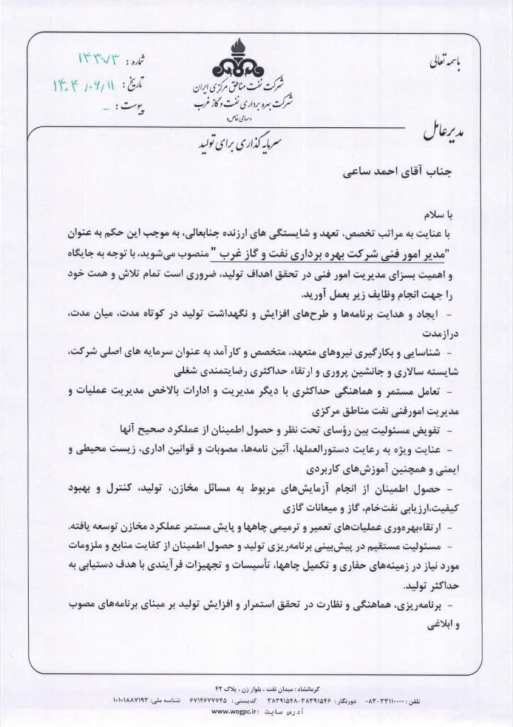 احمد ساعی به عنوان مدیر امور فنی این شرکت بهره برداری نفت و گاز غرب منصوب شد