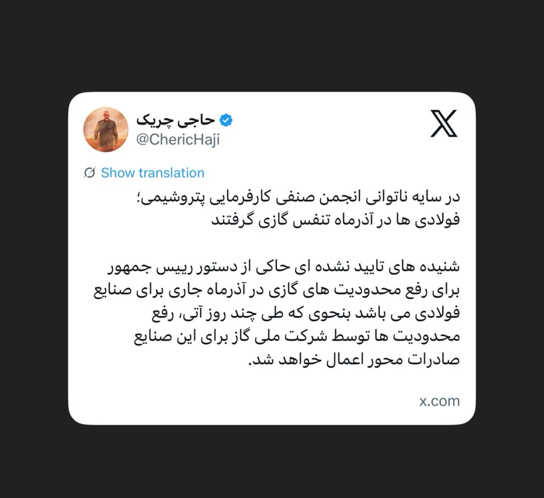 ‏شنیده های تایید نشده ای حاکی از دستور ريیس جمهور برای رفع محدودیت های گازی در آذرماه جاری برای صنایع فولادی می باشد بنحوی که طی چند روز آتی، رفع محدودی