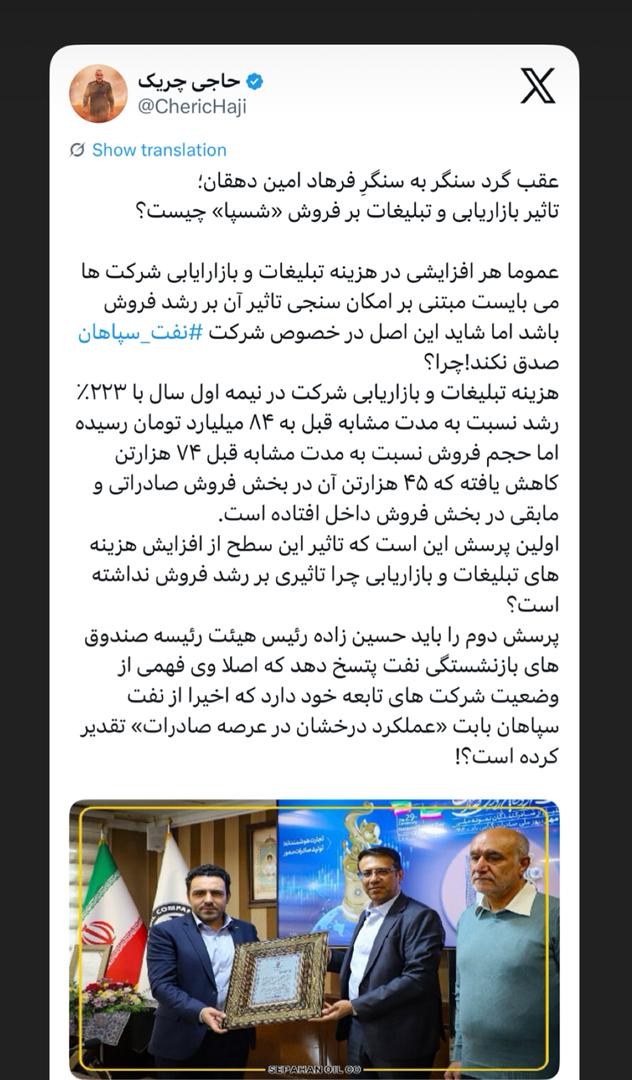 ‏_پرسش دوم را باید حسین زاده رئیس هیئت رئیسه صندوق های بازنشستگی نفت پتسخ دهد که اصلا وی فهمی از وضعیت شرکت های تابعه خود دارد که اخیرا از نفت سپاهان بابت «عملکرد درخشان در عرصه صادرات» تقدیر کرده است؟!