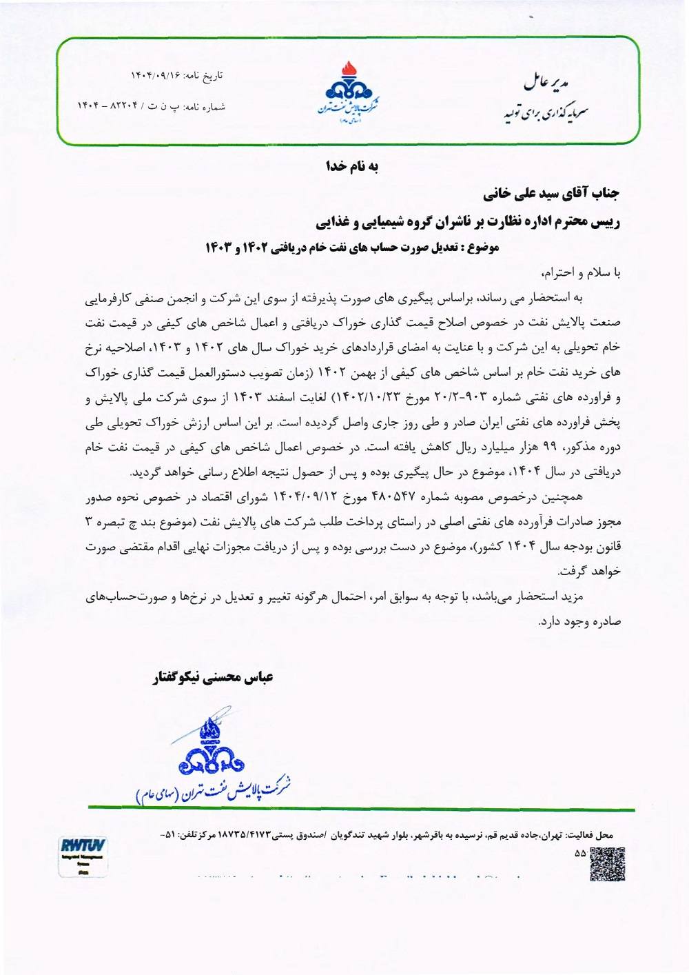 بر اساس پیگیری های صورت پذیرفته از سوی این شرکت و انجمن صنفی کارفرمایی صنعت پالایش نفت در خصوص اصلاح قیمت گذاری خوراک دریافتی و اعمال شاخص های کیفی در قیمت نفت خام تحویلی به این شرکت و با عنایت به امضای قراردادهای خرید خوراک سال های ۱۴۰۲ و ۱۴۰۳، اصلاحیه نرخ های خرید نفت خام بر اساس شاخص های کیفی از بهمن ۱۴۰۲ لغایت اسفندماه ۱۴۰۳ از سوی شرکت ملی پالایش و پخش فرآورده های نفتی ایران صادر و طی روز جاری واصل گردیده است.بر این اساس ارزش خوراک تحویلی طی دوره مذکور، ۹۹ هزارمیلیارد ریال کاهش یافته است.در خصوص اعمال شاخص های کیفی در قیمت نفت خام دریافتی در سال ۱۴۰۳، موضوع در حال پیگیری بوده و پس از حصول نتیجه اطلاع رسانی خواهد شد.