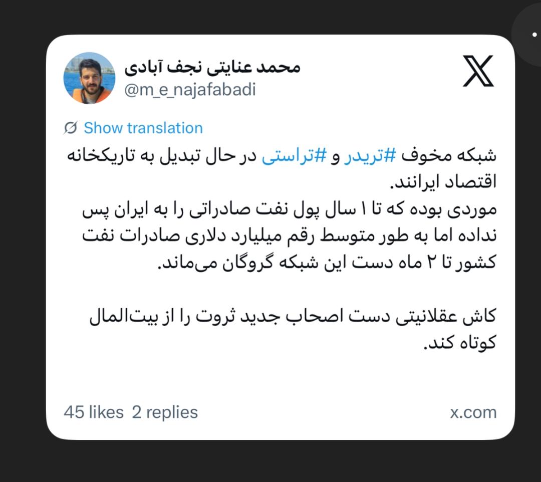 شبکه مخوف ⁧‫#تریدر‬⁩ و ⁧‫#تراستی‬⁩ در حال تبدیل به تاریکخانه اقتصاد ایرانند.