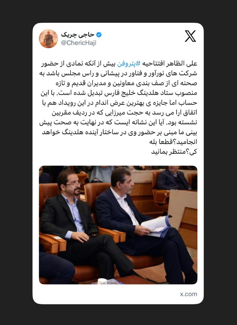 علی الظاهر افتتاحیه #پتروفن بیش از آنکه نمادی از حضور شرکت های نورآور و فناور در پیشانی و راس مجلس باشد به صحنه ای از صف بندی معاونین و مدیران قدیم و تازه منصوب ستاد هلدینگ خلیج فارس تبدیل شده است. با این حساب اما جایزه ی بهترین عرض اندام در این رویداد هم با اتفاق ارا می رسد به حجت میرزایی که در ردیف مقربین نشسته بود. آیا این نشانه ایست که در نهایت به صحت پیش بینی ما مبنی بر حضور وی در ساختار آینده هلدینگ خواهد انجامید؟قطعا بله