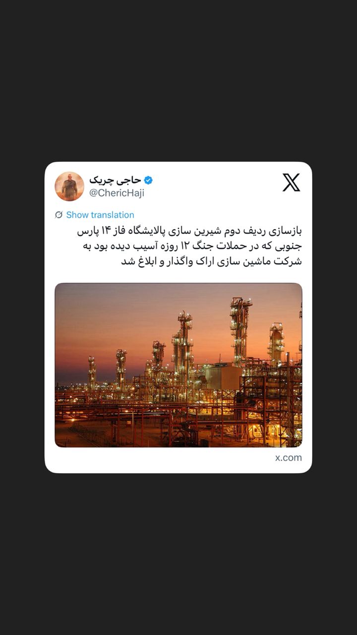 بازسازی ردیف دوم شیرین سازی پالایشگاه فاز ۱۴ پارس جنوبی که در حملات جنگ ۱۲ روزه آسیب دیده بود به شرکت ماشین سازی اراک واگذار و ابلاغ شد