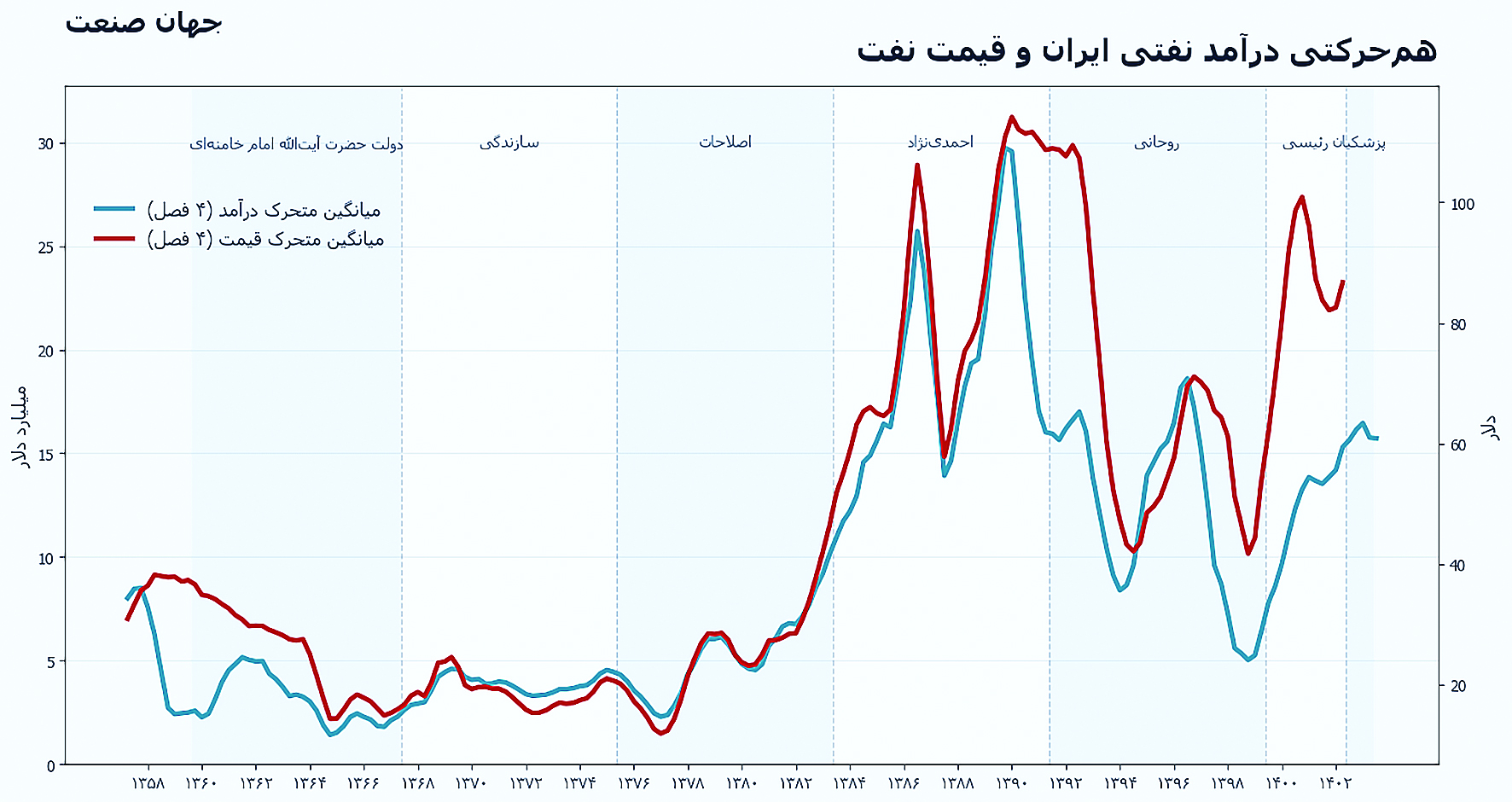 این دوره بهطور مشخص به دو بخش متمایز تقسیم میشود؛ در دوره نخست (۱۳۹۲تا۱۳۹۶) و همزمان با اجرای برجام، درآمدهای نفتی بهصورت موقت احیا شد. میانگین درآمد نفتی فصلی به حدود ۱۵تا۱۶میلیارد دلار افزایش یافت و قیمت نفت پس از سقوط سال۱۳۹۳ به محدوده ۵۰تا۶۰ دلار بازگشت. در دوره دوم (۱۳۹۶تا۱۴۰۰) و با خروج آمریکا از برجام اما درآمدهای نفتی با سقوطی کمسابقه مواجه شد بهطوری که میانگین درآمد فصلی به حدود ۷تا۸میلیارد دلار کاهش یافت و در برخی فصول به کمتر از ۵میلیارد دلار رسید.