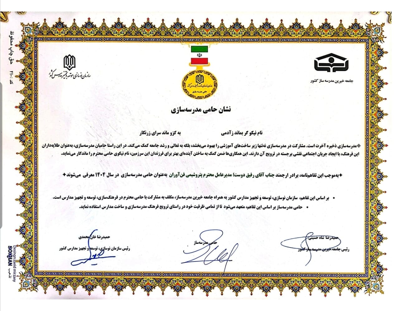 مدال افتخار «حامی مدرسهسازی ایران» به شرکت پتروشیمی فنآوران اهدا شد