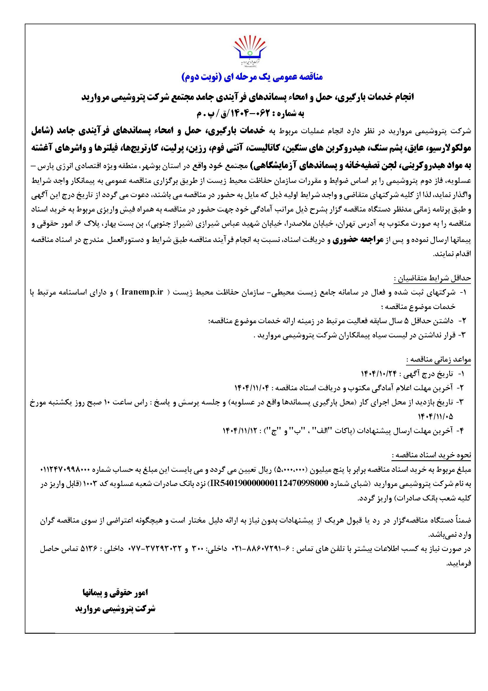شرکت پتروشیمی مروارید در نظر دارد انجام عملیات مربوط به خدمات بارگیری، حمل و امحاء پسماندهای فرآیندی جامد (شامل مولکولارسیو، عایق، پشم سنگ، هیدروکربن های سنگین، کاتالیست، آنتی فوم، رزین، پرلیت، کارتریج¬ها، فیلترها و واشرهای آغشته به مواد هیدروکربنی، لجن تصفیه¬خانه و پسماندهای آزمایشگاهی) مجتمع خود واقع در استان بوشهر، منطقه ویژه اقتصادی انرژی پارس – عسلویه، فاز دوم پتروشیمی را بر اساس ضوابط و مقررات سازمان حفاظت محیط زیست از طریق برگزاری مناقصه عمومی به پیمانکار واجد شرایط واگذار نماید.
