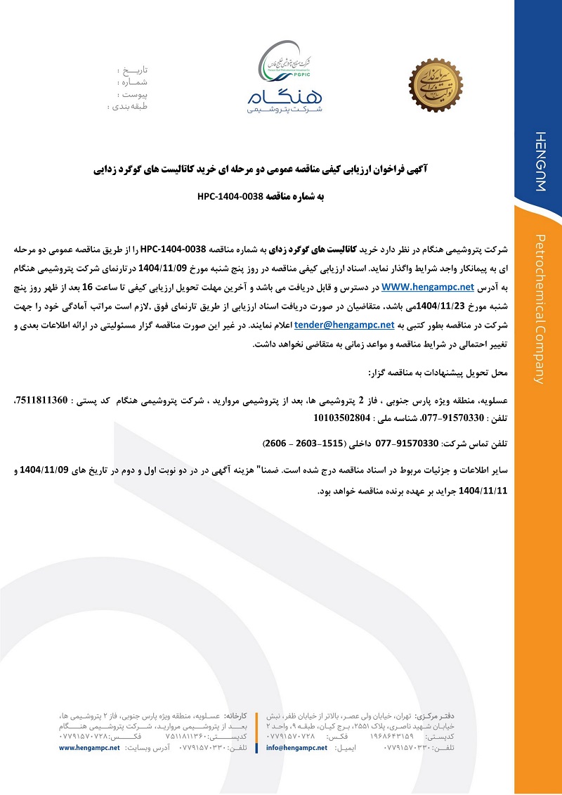 شرکت پتروشیمی هنگام در نظر دارد خرید کاتالیست های گوگرد زدای به شماره مناقصه -1404-0038HPC را از طریق مناقصه عمومی دو مرحله ای به پیمانکار واجد شرایط واگذار نماید. اسناد ارزیابی کیفی مناقصه در روز پنج شنبه مورخ /09 /11 1404 در تارنما ی شرکت پتروش یمی هنگام به آدرس WWW.hengampc.net در دسترس و قابل دریافت می باشد و آخرین مهلت تحویل ارزیابی کیفی تا ساعت 16 بعد از ظهر روز پنچ شنبه مورخ /23 /11 1404می باشد. متقاضیان در صورت دریافت اسناد ارزیابی از طریق تارنمای فوق ,الزم است مراتب آمادگی خود را جهت شرکت در مناقصه بطور کتبی به net.hengampc@tender اعالم نمایند. در غیر این صورت مناقصه گزار مسئولیتی در ارائه اطالعات بعدی و تغییر احتمالی در شرایط مناقصه و مواعد زمانی به متقاضی نخواهد داشت.