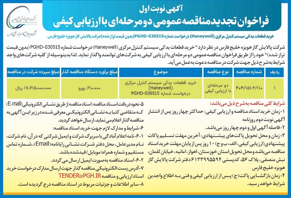 آگهي نوبت اول فراخوان تجدید مناقصه عمومی دو مرحله ای با ارزیابی کیفی خرید قطعات یدکی سیستم کنترل مرکزی (Haneywell) درخواست شماره PGHD-030515، (بدون قیمت تراز شده) شرکت پالایش گاز هویزه خلیج فارس