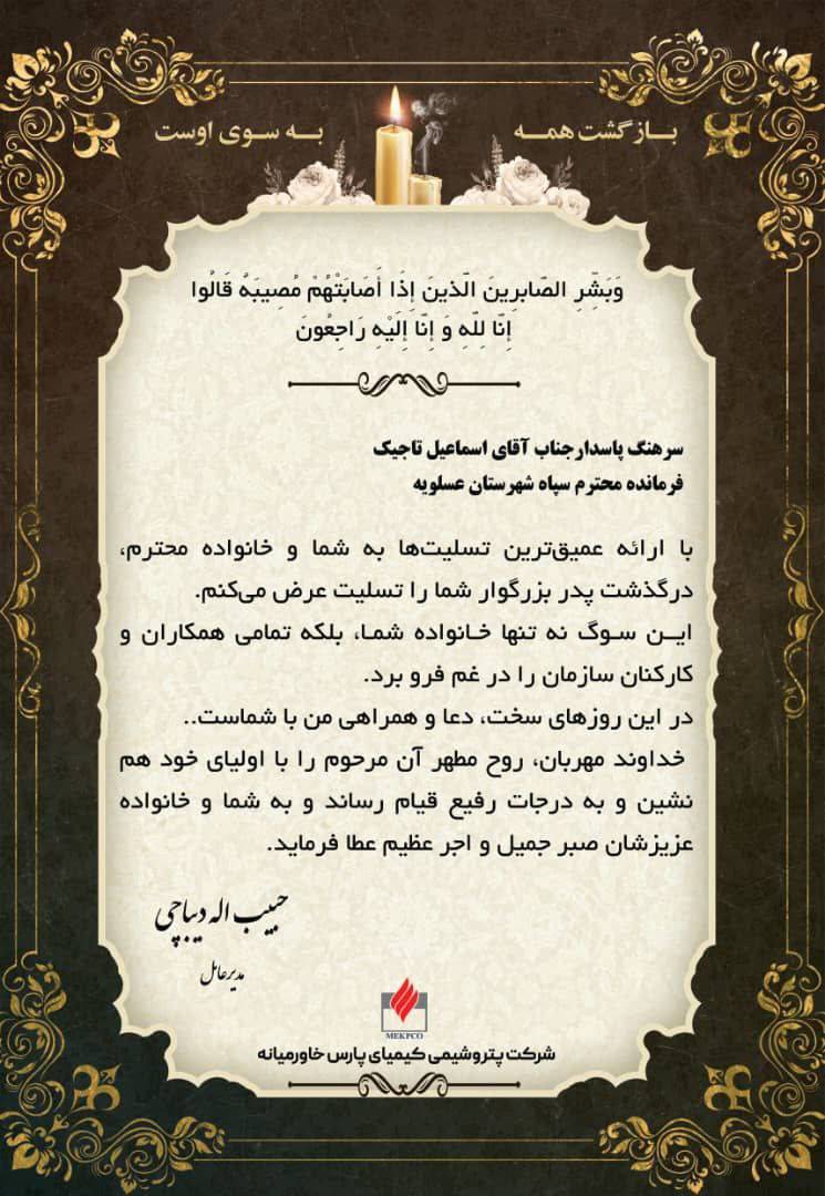 پیام تسلیت مدیرعامل پتروشیمی کیمیای پارس خاورمیانه به فرمانده سپاه شهرستان عسلویه