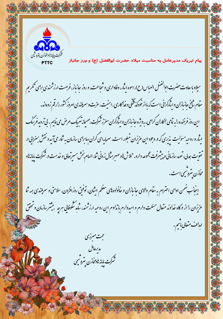 پیام تبریک مدیرعامل شرکت پایانه ها و مخازن پتروشیمی به مناسبت میلاد حضرت ابوالفضل العباس(ع) و روز جانباز
