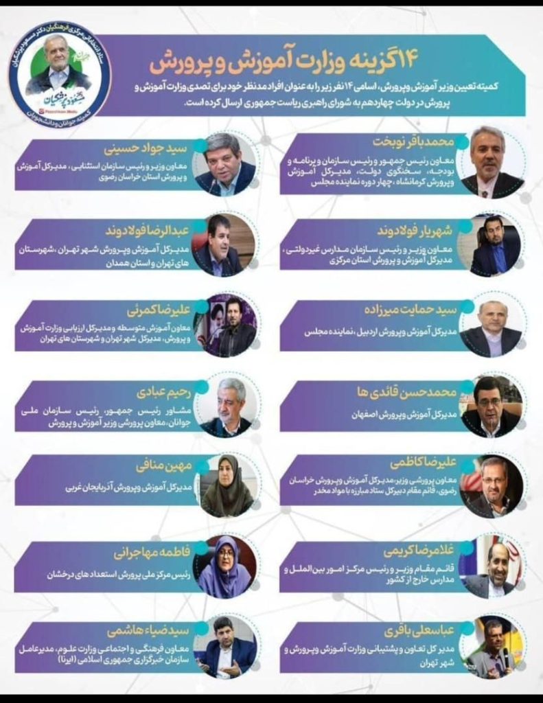 گزینه وزارت آموزش و پرورش که از سوی یکی از اعضای کمیته تعیین وزیر آموزش و پرورش انتشار یافته که در این بین وجود محمدباقر نوبخت ۷۴ساله بر خلاف بازه سنی اعلام شده قابل توجه بوده هرچند با توجه به ارتباطات این مقام سابق، بعید نیست از سوی دولت به مجلس معرفی گردد.