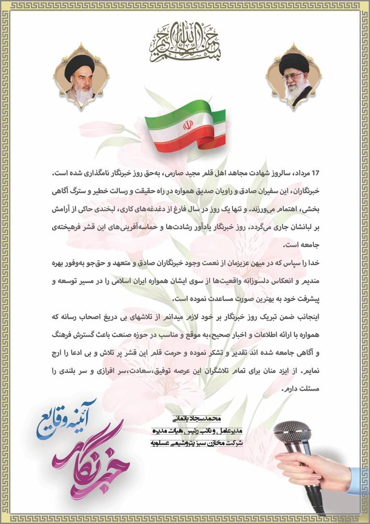 پیام تبریک مهندس باتمانی مدیرعامل مخازن سبز به مناسبت روز خبرنگار
